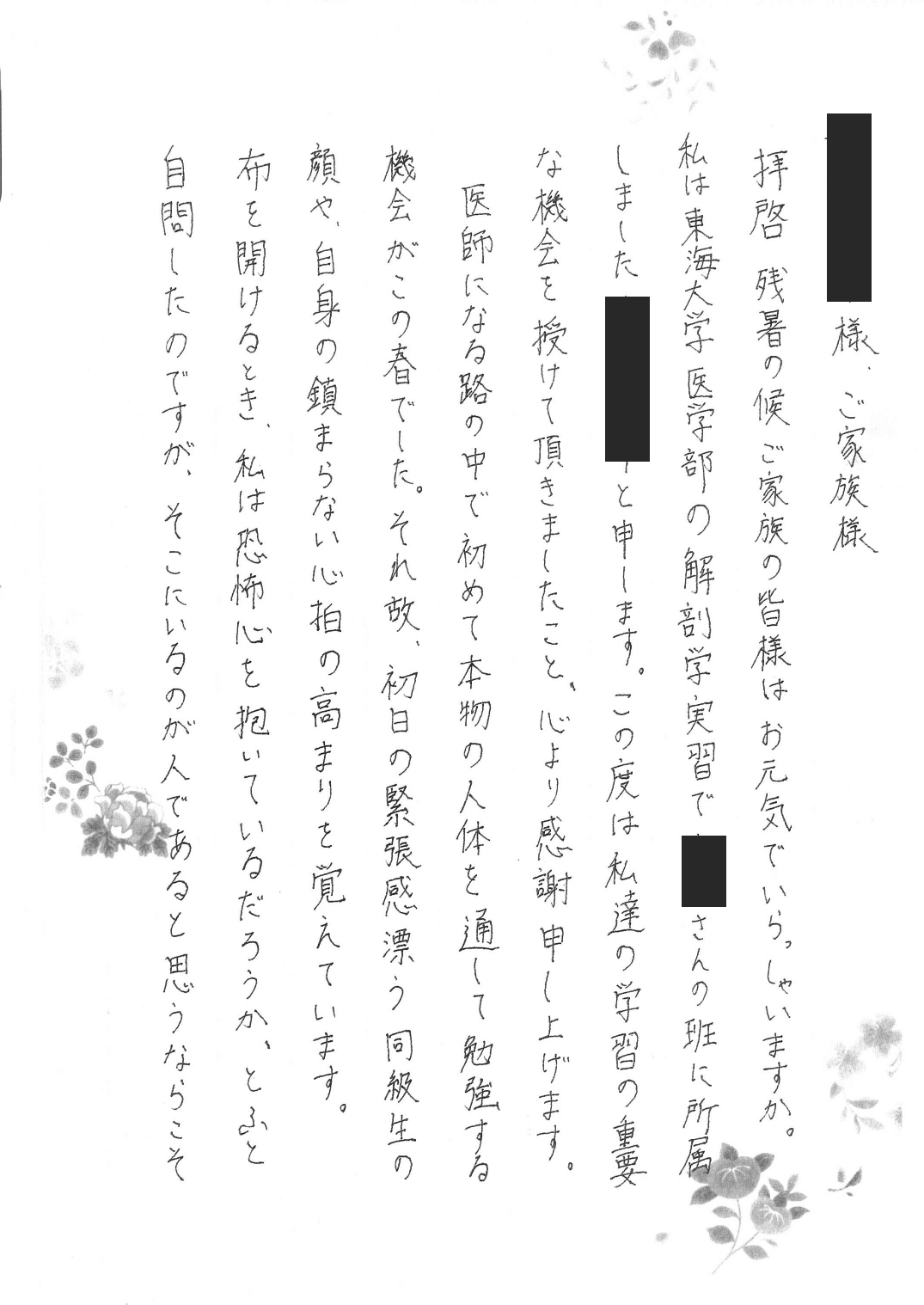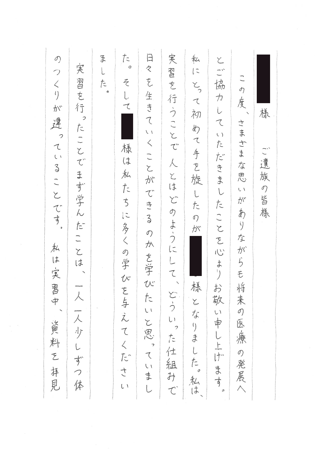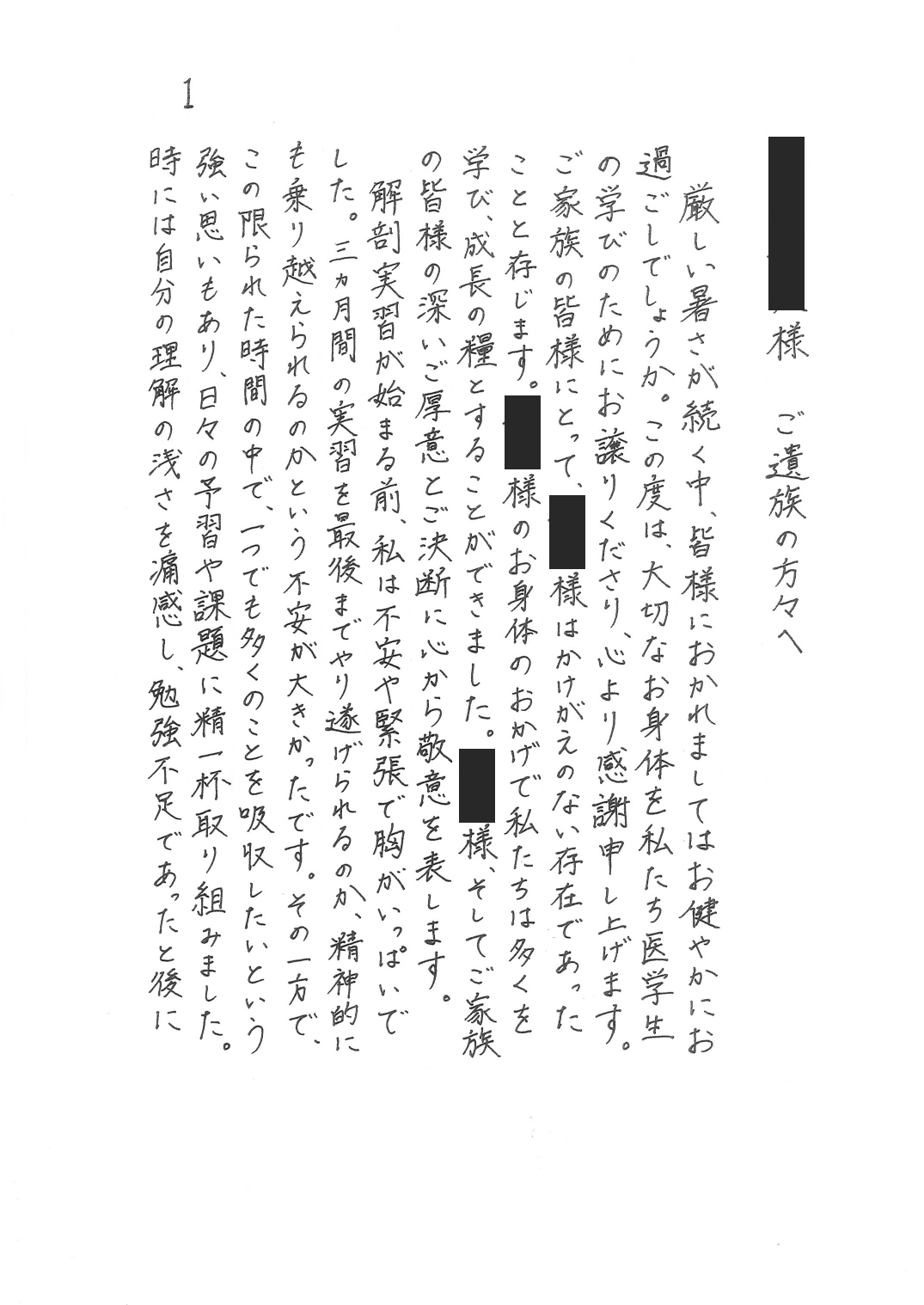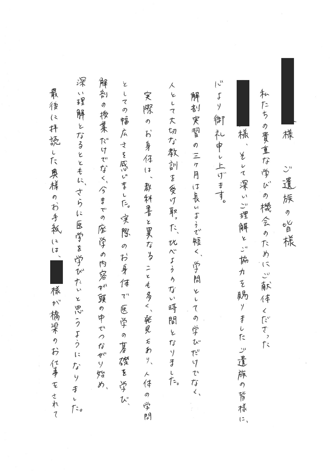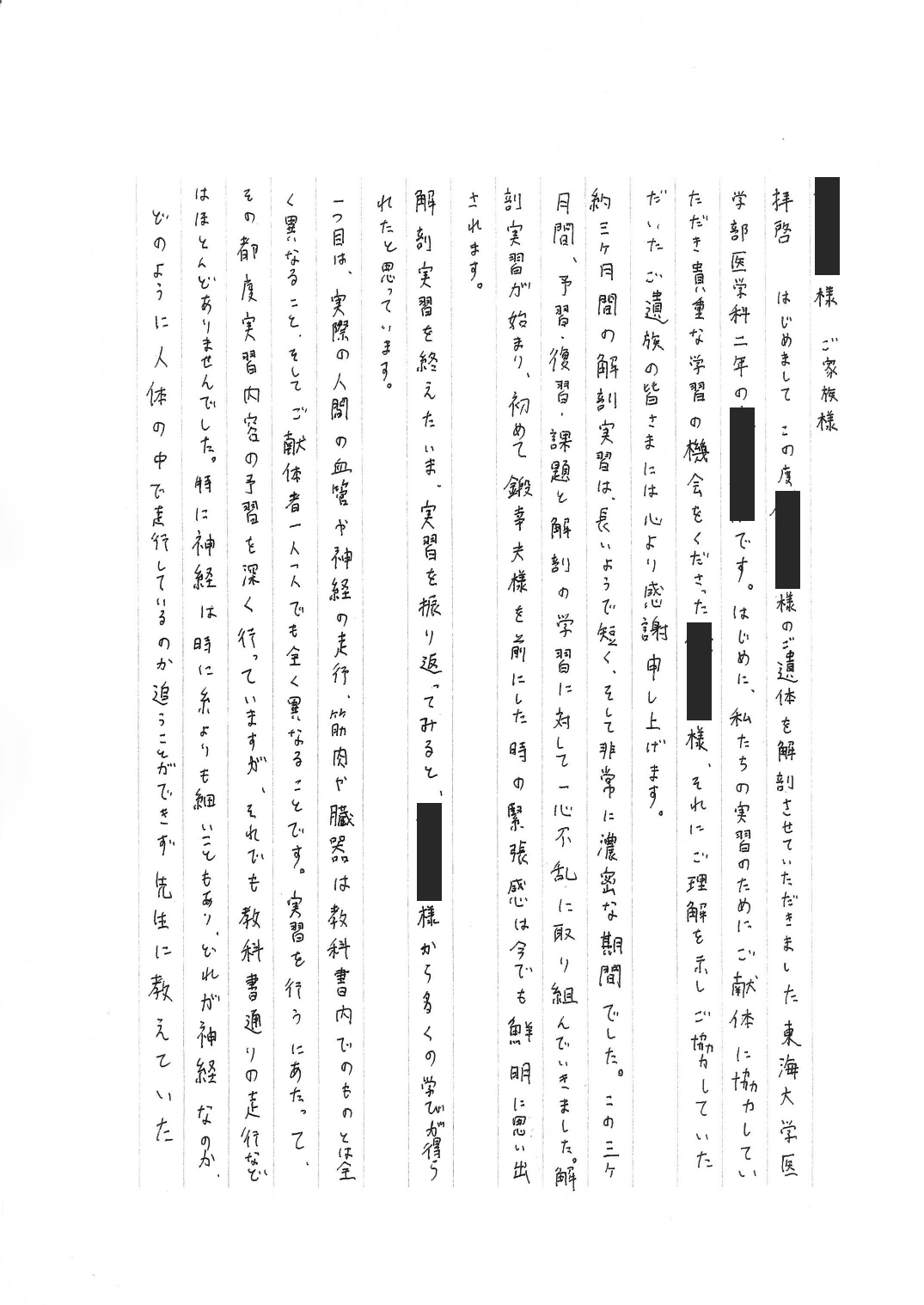 ●●様のご家族様へ 拝啓 はじめまして。今回●●様のご遺体を解剖させて頂きました、東海大学医学部医学科二年の●●と申します。