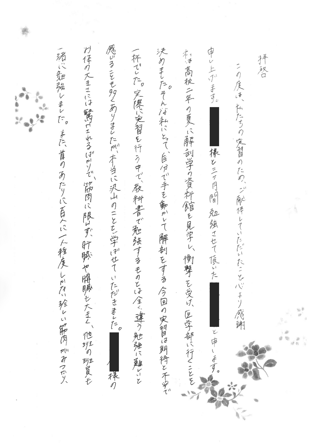 拝啓 はじめましてこの度●●様のご遺体を解部させていただきました 東海大学医学部医学科三年の●●です。はじめに、私たちの実習のためにご献体に協やしていただき貴重な学習の機会をくださった●●様…